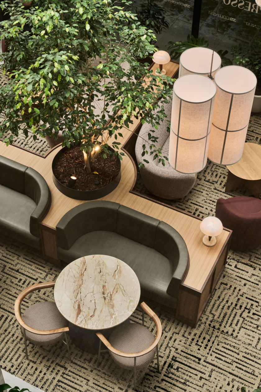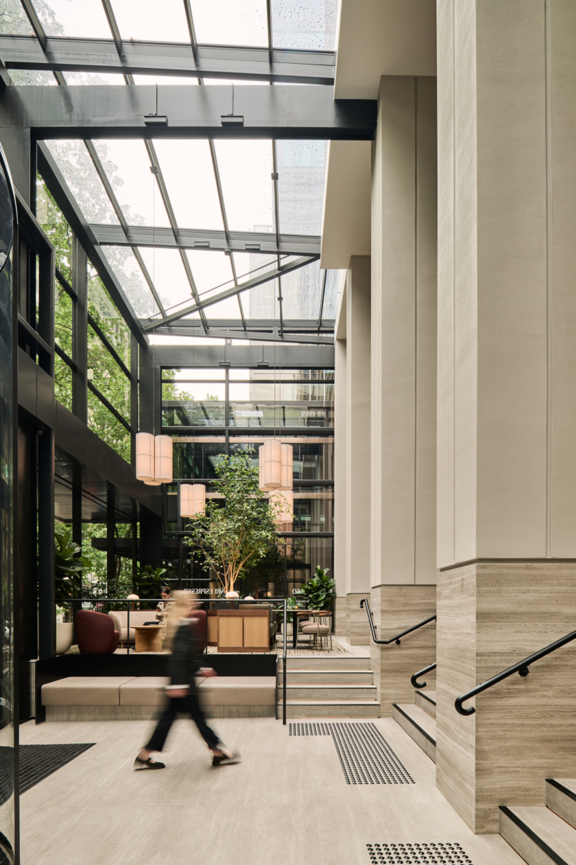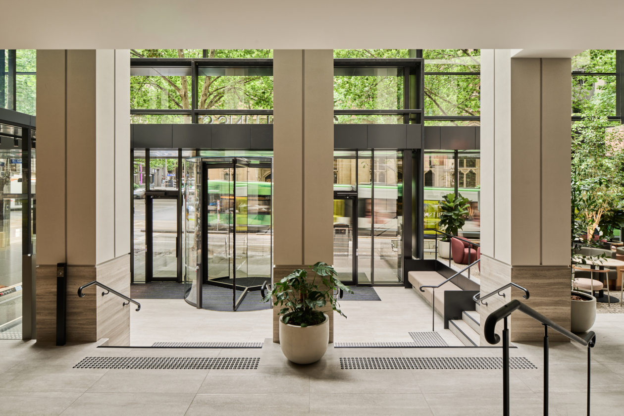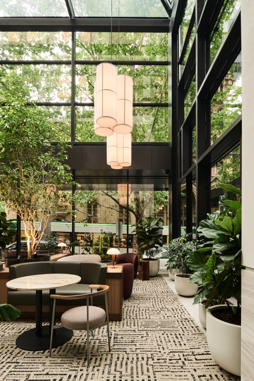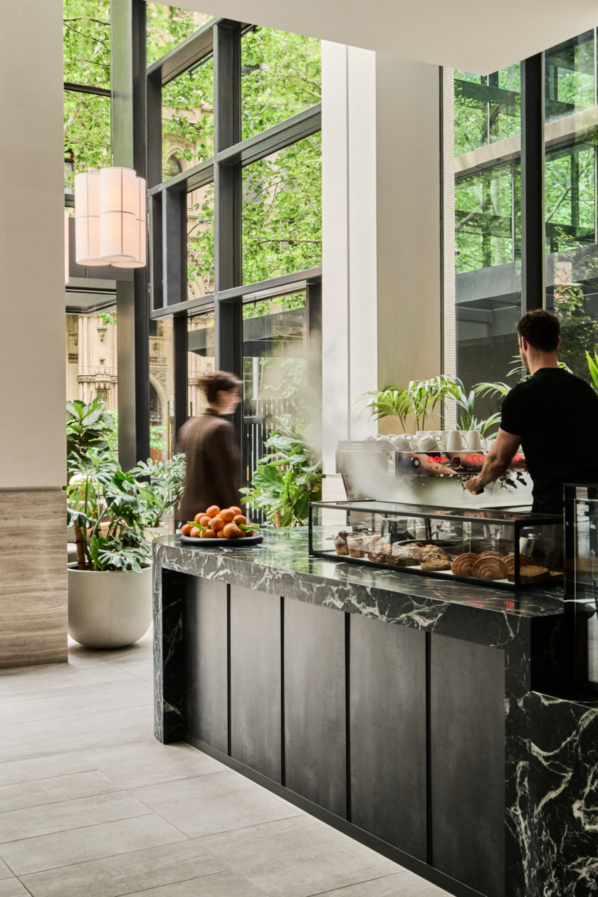 Studio Tate designed the lobby at 379 Collins Street as a welcoming urban threshold, combining landscape, materiality and light to enhance the arrival experience. Integrated planting and a warm, stone-led material palette create a calm, human-centred environment for tenants and visitors.