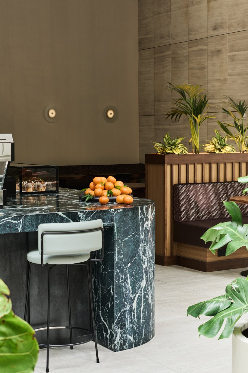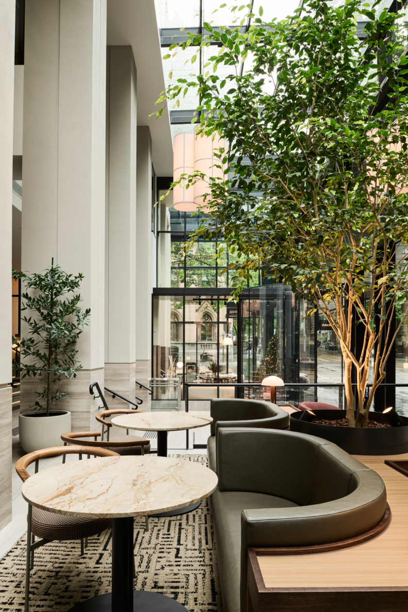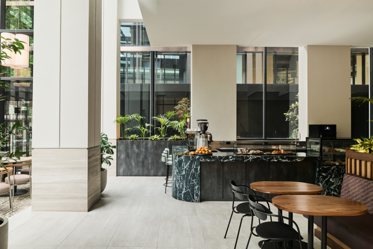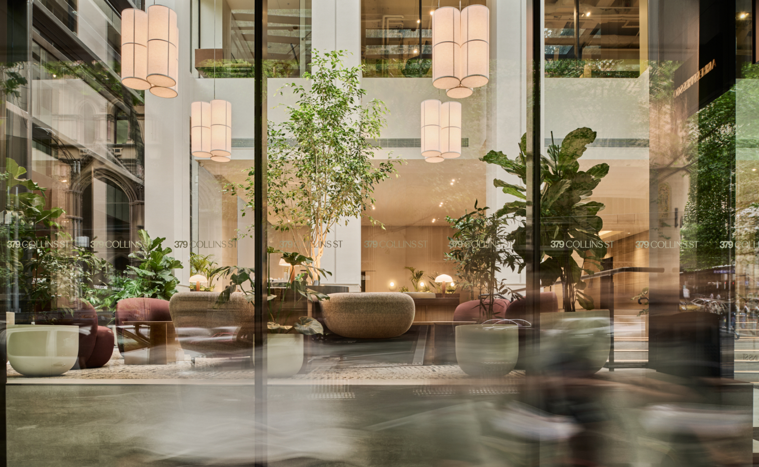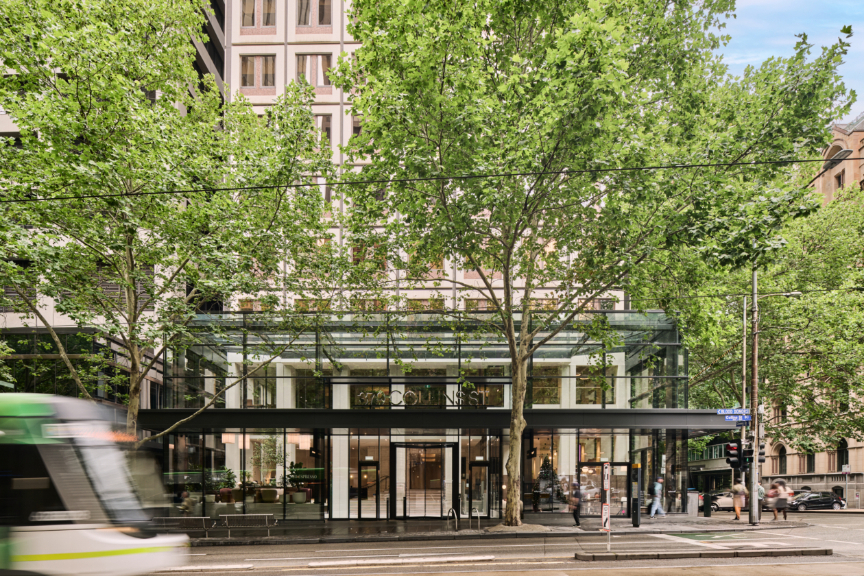 Studio Tate designed the lobby at 379 Collins Street as a welcoming urban threshold, combining landscape, materiality and light to enhance the arrival experience. Integrated planting and a warm, stone-led material palette create a calm, human-centred environment for tenants and visitors.