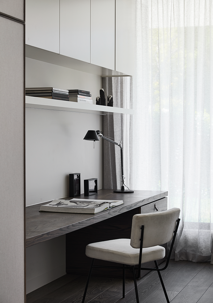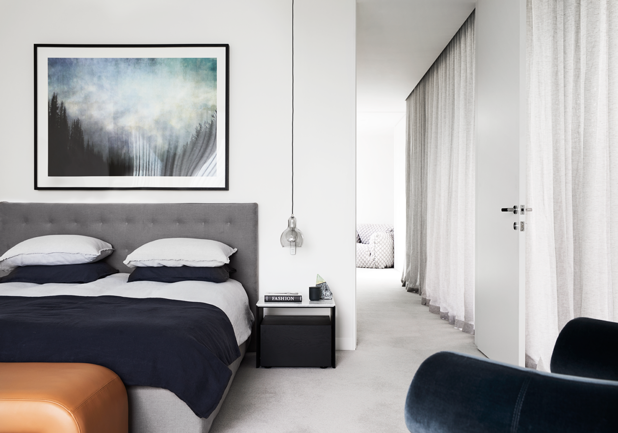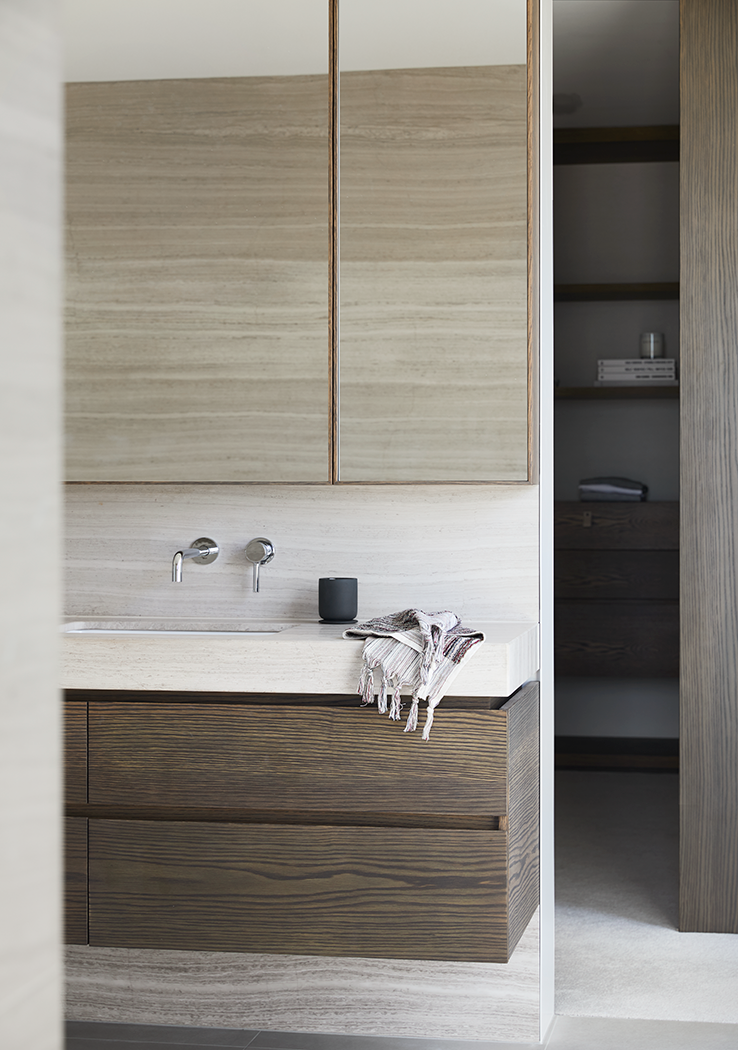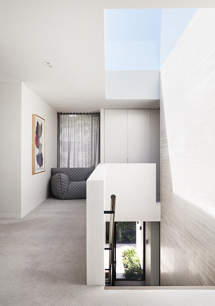 Upon opening the custom pivot entry door, a large skylight above the open tread staircase creates variations of light and shade that change with the day. The polished plaster hallway wall suggests the subtle theme of customisation; further expressed through an interior palette of warm timber joinery, leather pull handles, metal elements, natural stone and soft, circular pendants and wall sconces.