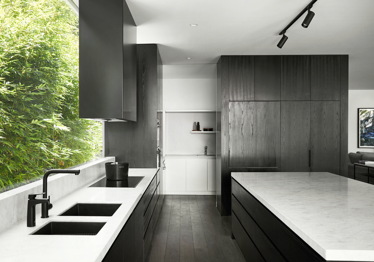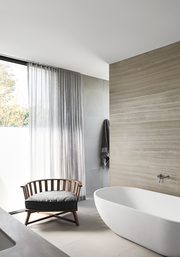 A private family home that marries sophistication and function while being timeless in its modernity with rectilinear lines, robust materials, and a focus on the landscape. Stone walls, timber screens and black steel are softened by carefully designed gardens and a timeless interior palette.