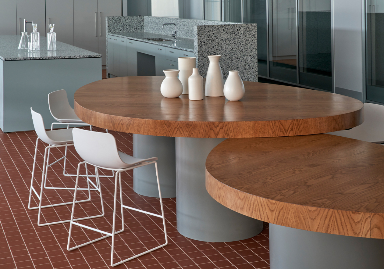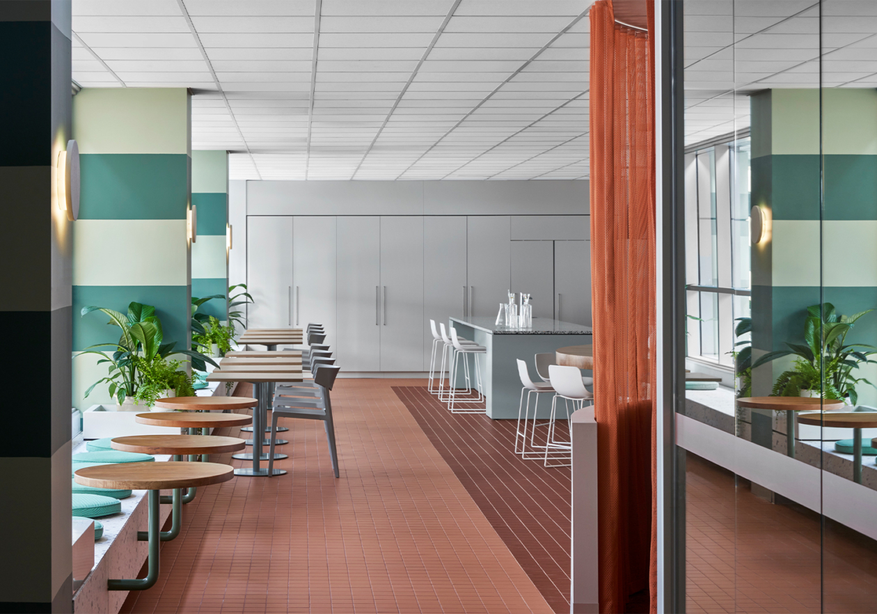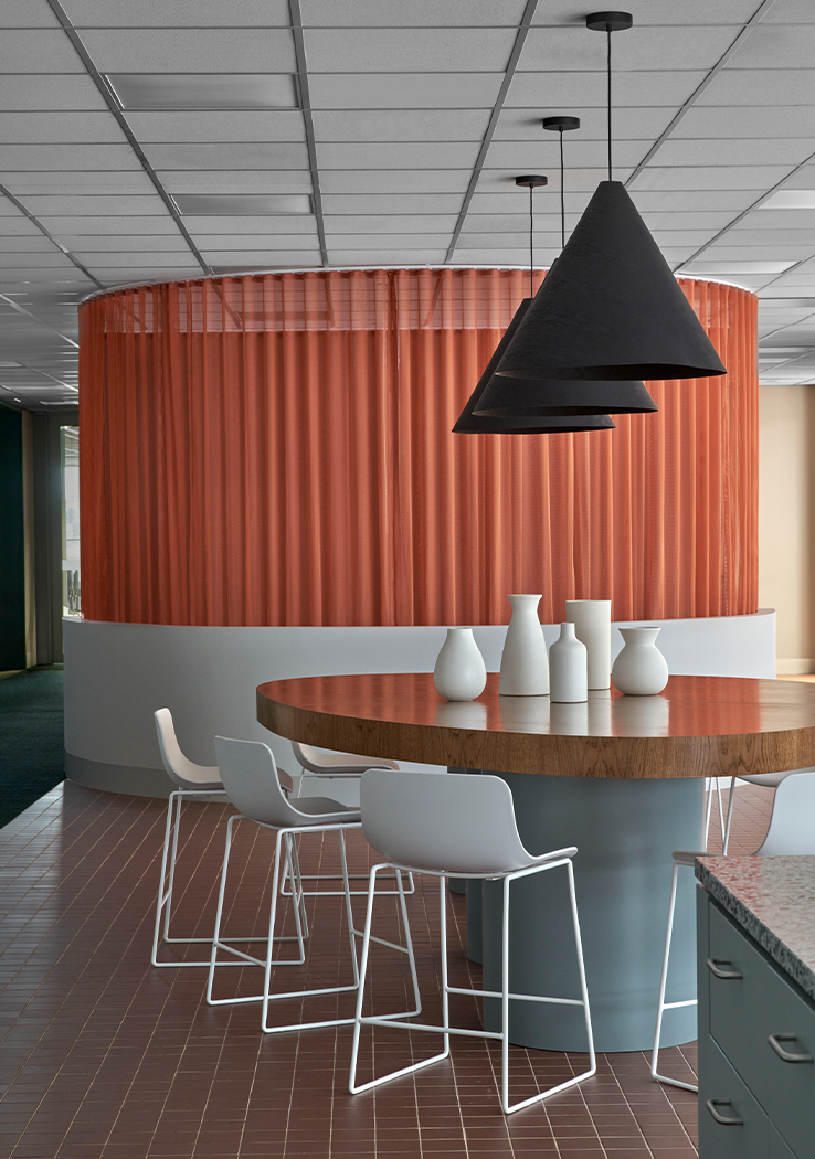 Additional collaboration zones punctuate the work floor with sheer perforated curtains used to create privacy, while still being part of an open plan scheme. In the large kitchen that, along with the adjacent seminar area, allows Burnet to host large social gatherings, tiles in red and caramel are offset by a terrazzo benchtop and tables adding textural contrast.