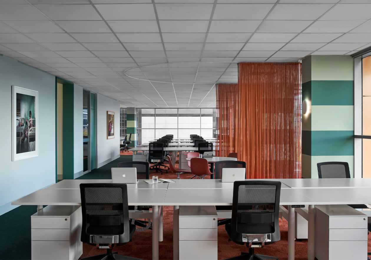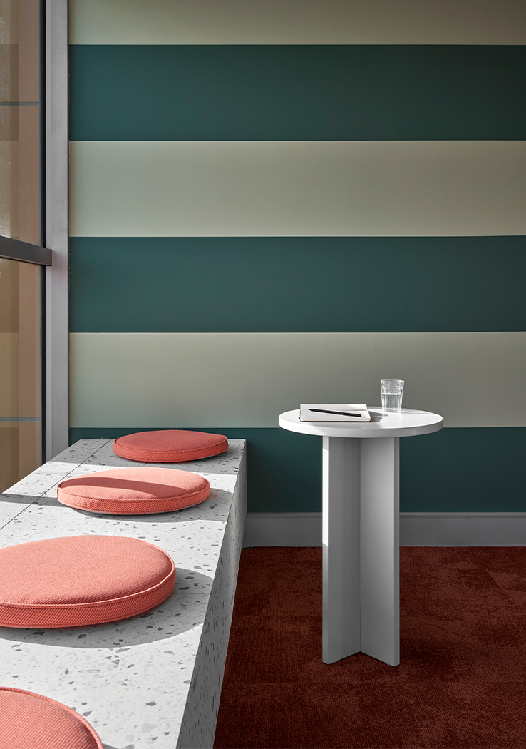 Thoroughfares between east and west were added to the new work floor to encourage teams to move between them, while communal and breakout spaces were created to encourage collaboration and interaction using colour blocking with terracotta and eucalyptus green carpet used to define these central and perimeter work zones.