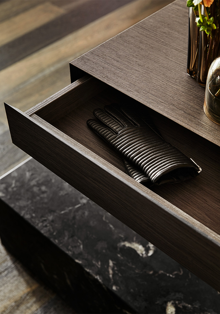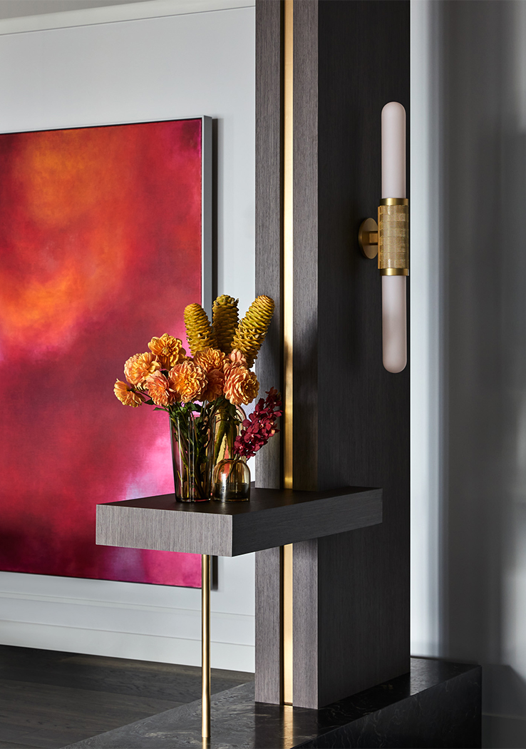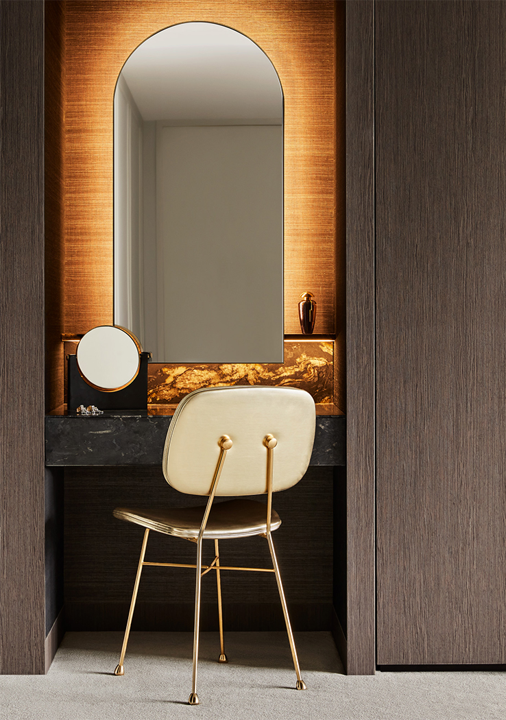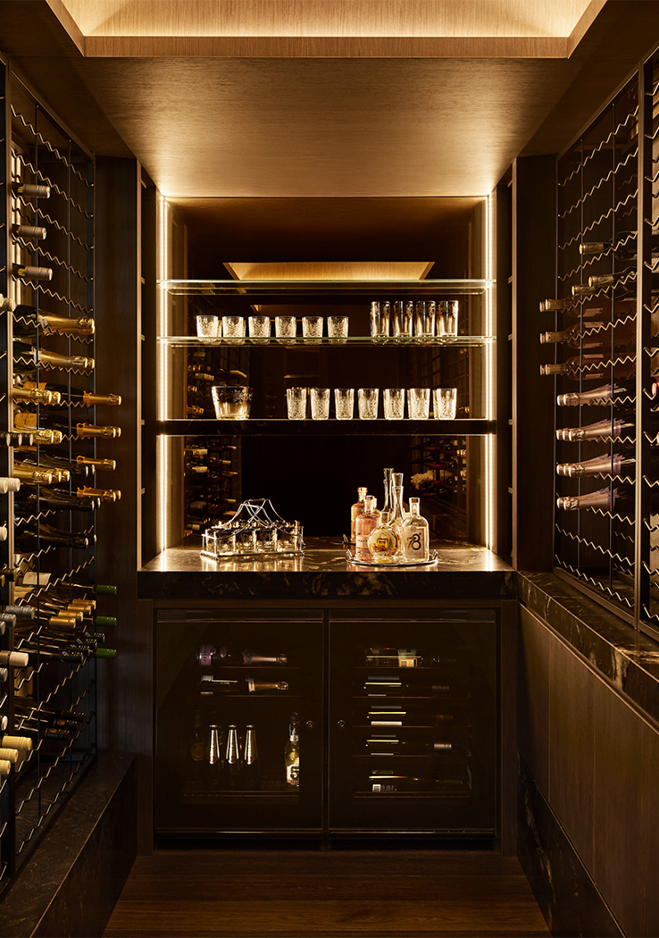 Textured wallpaper and applied strapping detailing to the walls is used to frame feature lighting and artwork, the colours selected to enhance and compliment the objects within the spaces. Bespoke joinery, including an extensive wine room, utilises walnut timber veneer, stone and brass. This classic combination is thoughtfully offset by adventurous upholsteries and rugs, all combining to elevate the apartment to a finish befitting its location.