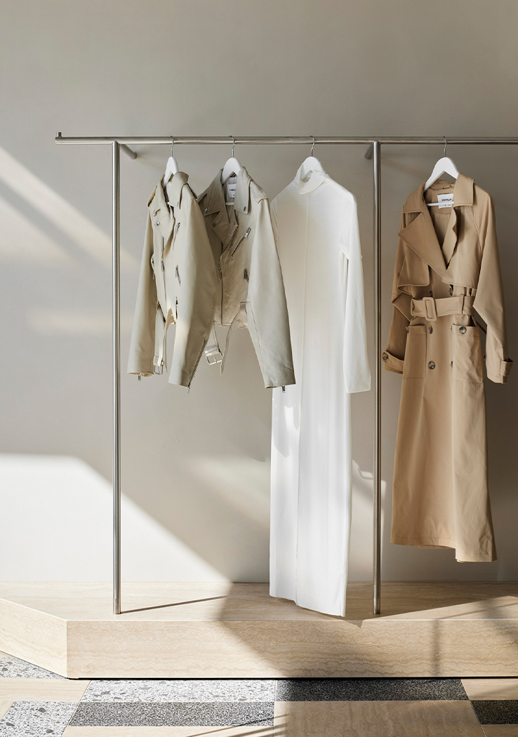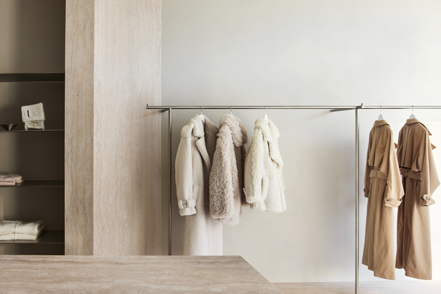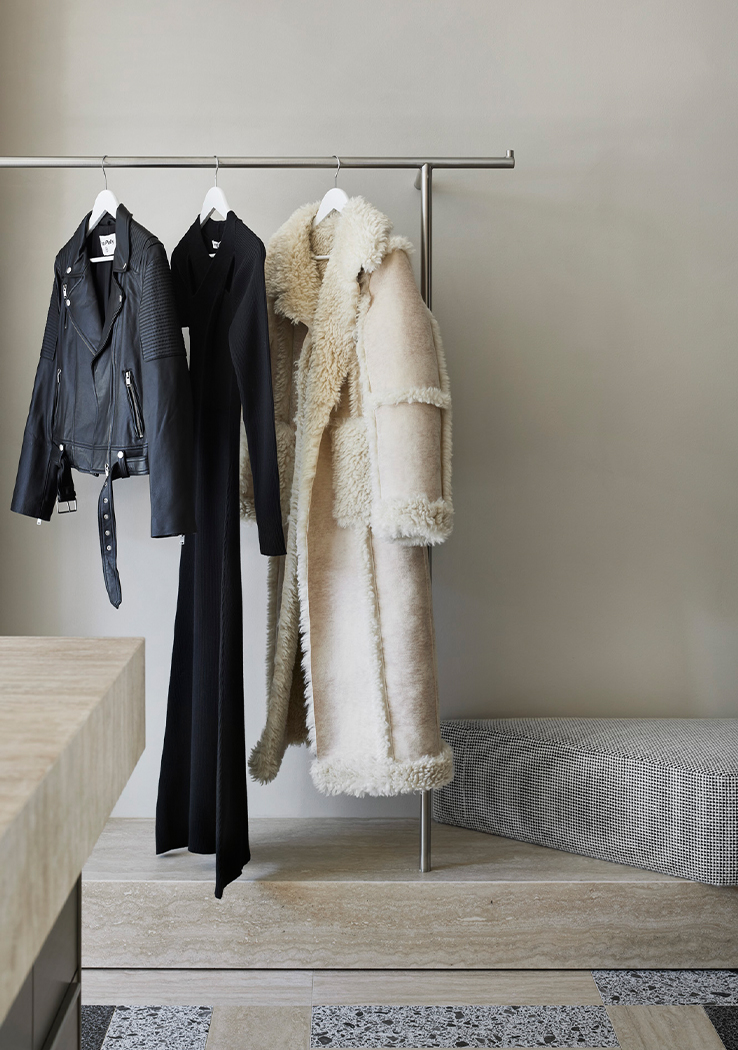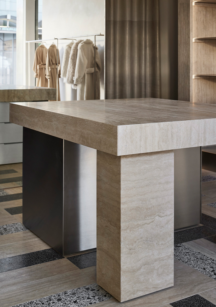 A striking tessellated floor defines the store’s footprint, with creamy vein-cut travertine tiles and bold, black and white terrazzo insets. Soft touches, like bouclé upholstery and cut pile carpet, enhance the space’s refined comfort. Elegant restraint characterises the space, with custom brushed stainless steel hanging rails and oversized display shelves, providing a sleek backdrop for showcasing new-season pieces. Aniline leather, floor-to-ceiling curtains, in generously proportioned changerooms, add depth and softness.