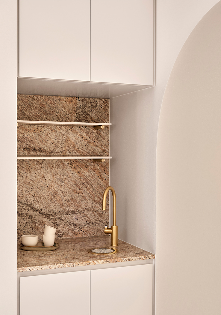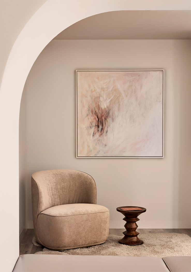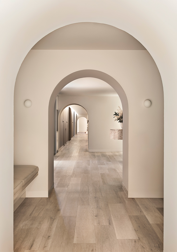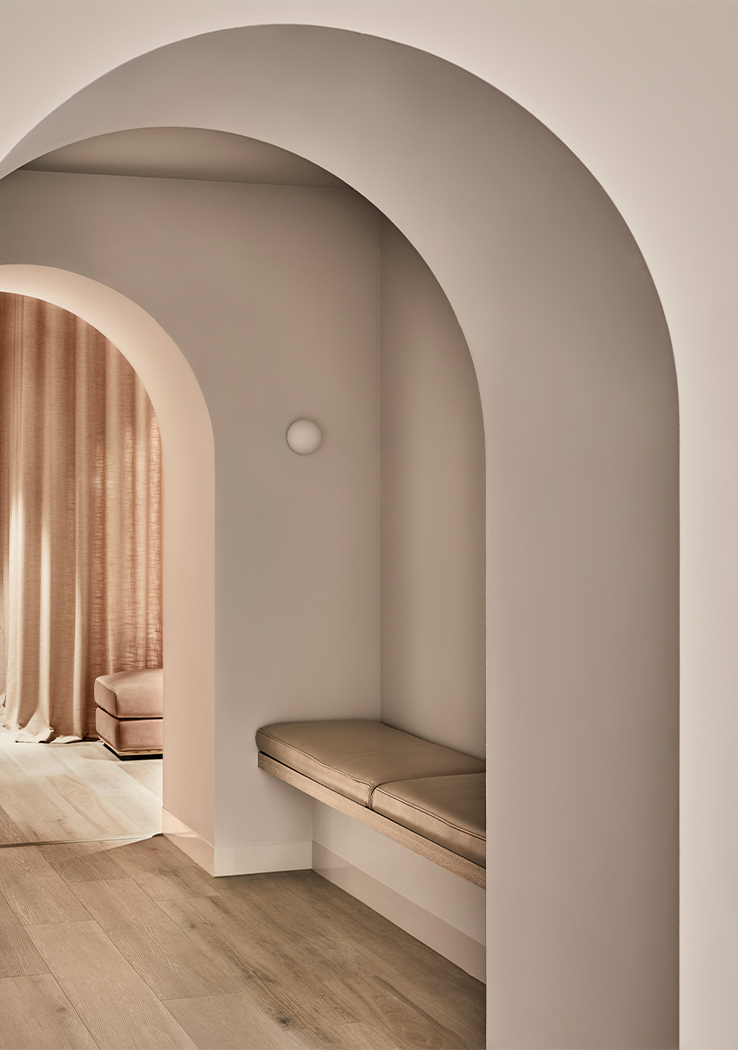 Colour, texture and form merge to create a layered canvas of muted, tonal hues enlivened with arched thresholds, rendered walls and soft, recessed lighting.