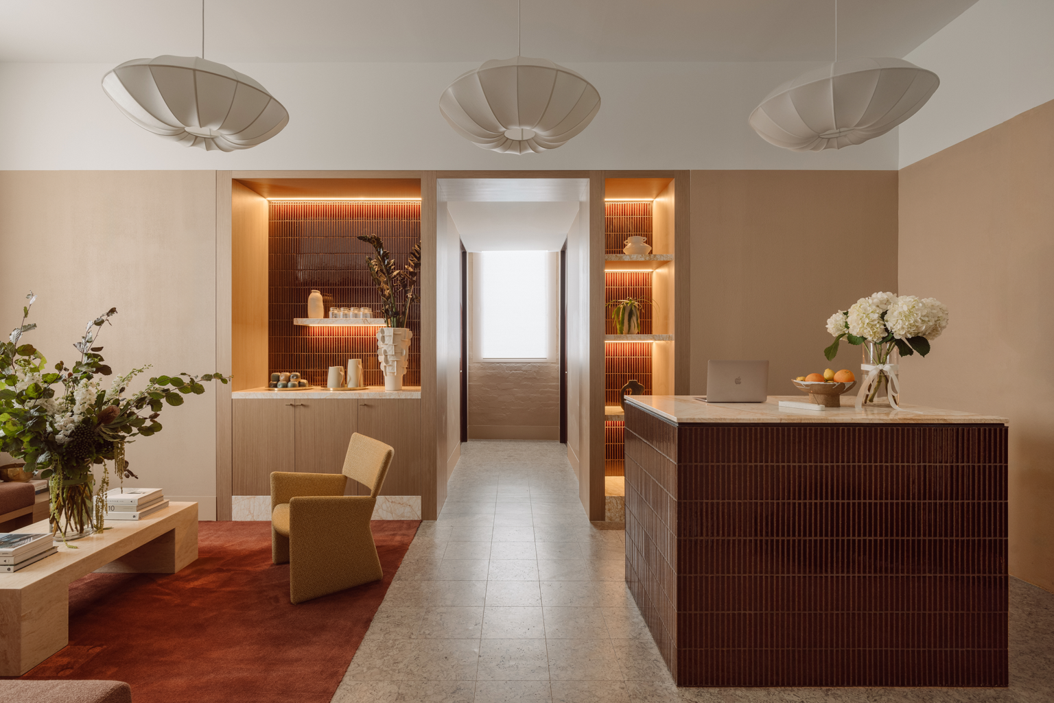 The design response leverages the site’s generous ceiling height to create an open and inviting reception area, anchored by a consistent datum line, a custom banquette lounge, and softly layered lighting to establish a sense of intimacy. A warm and tactile material palette—including a tiled reception counter, rendered finishes, and textured fabrics—introduces a sense of depth and character to the front-of-house experience.