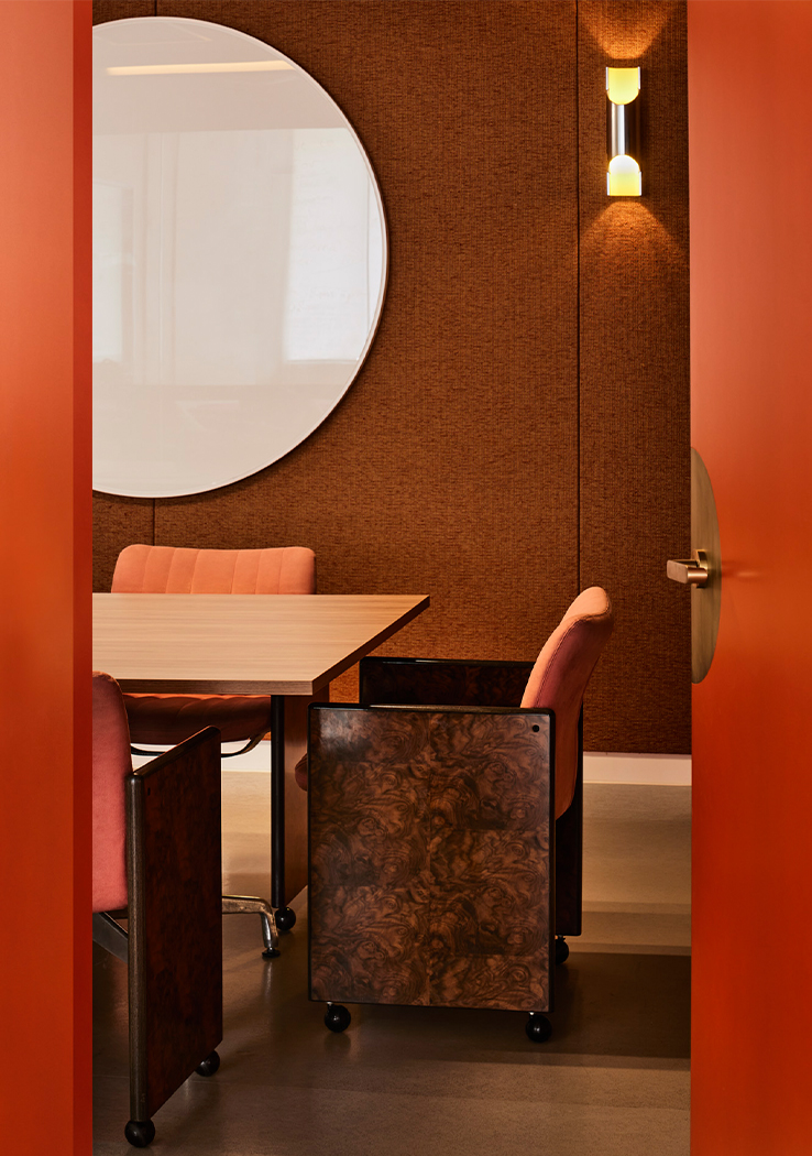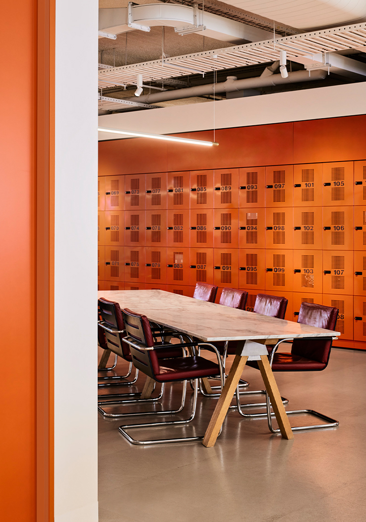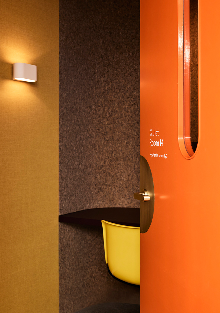 Forming part of a larger campus of buildings, all dedicated to MECCA, the mid-century warehouse offers an industrial backdrop to the centre’s richly layered interior. The raw building envelope is embraced, while built forms sit as pods nestled below the exposed truss roof. Window seats and workstations brim the perimeter of each work floor, flanked by lounge settings that encourage teams to gather for group tasks. A central spine of meeting, quiet, and wellness rooms offer visual and acoustic privacy, with a series of water points and lockers creating moments of reprieve between. The dexterous planning enables clear sightlines and abundant natural light across the floorplate to enhance connection and wellbeing among staff and visitors.