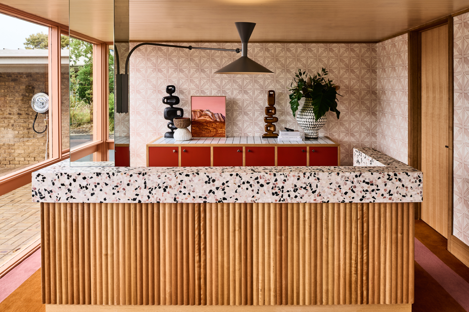Setting a playful and inviting tone from the first encounter, the reception greets visitors with a lively orange-and-pink striped carpet, offset against an artisanal wallpaper embellished with the bold brushstrokes of Indigenous Australian designer, Jimmy Pike. The creative narrative continues into the motel rooms where Studio Tate has infused beauty, character and comfort into the existing structure with its original floorplans. Each room is marked by a mint-green door and room signage in burnt orange. Originally used for delivering food to rooms, the signage has been adapted into beacon-like alcoves – serving as a wayfinding device that echoes the motel’s broader creative narrative.