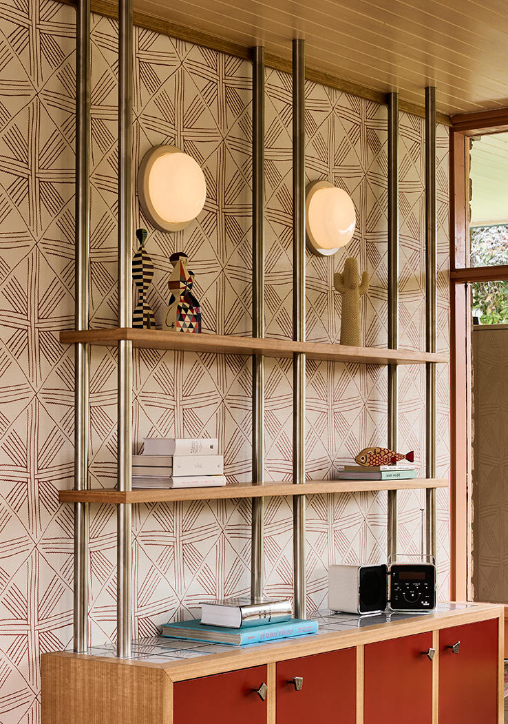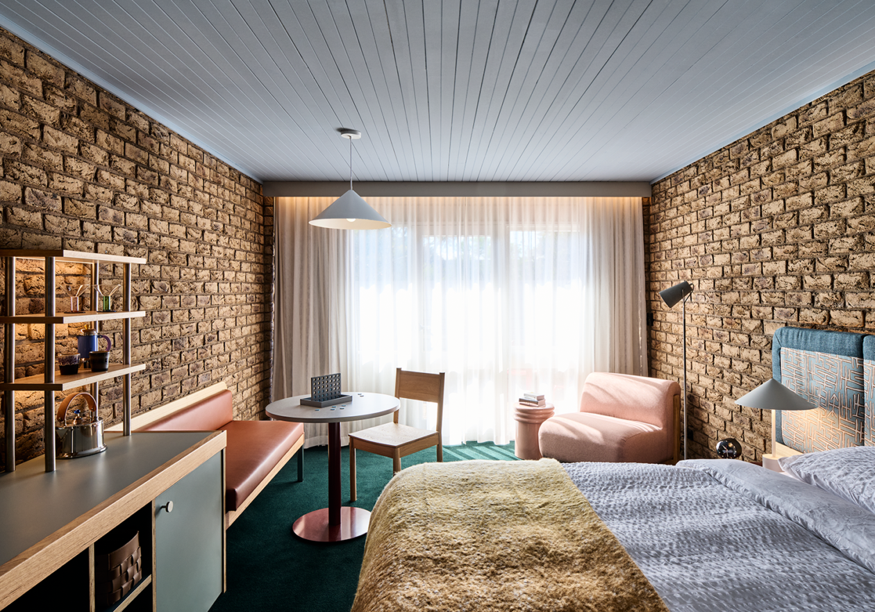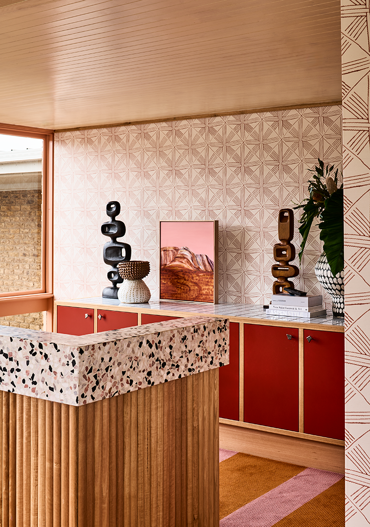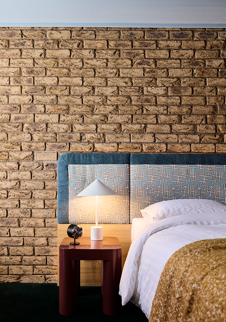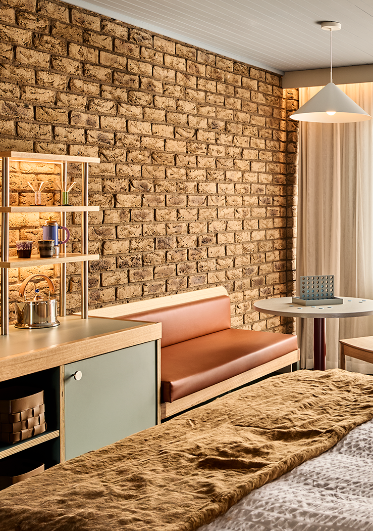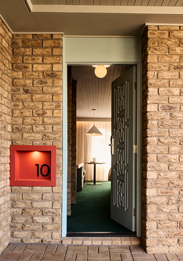 Setting a playful and inviting tone from the first encounter, the reception greets visitors with a lively orange-and-pink striped carpet, offset against an artisanal wallpaper embellished with the bold brushstrokes of Indigenous Australian designer, Jimmy Pike. The creative narrative continues into the motel rooms where Studio Tate has infused beauty, character and comfort into the existing structure with its original floorplans. Each room is marked by a mint-green door and room signage in burnt orange. Originally used for delivering food to rooms, the signage has been adapted into beacon-like alcoves – serving as a wayfinding device that echoes the motel’s broader creative narrative.
