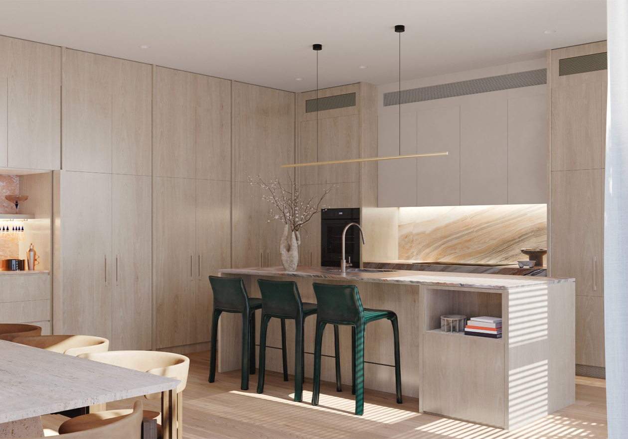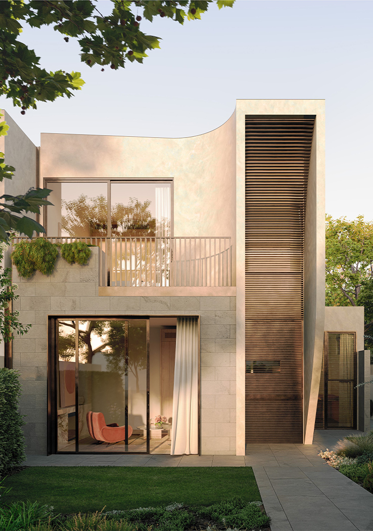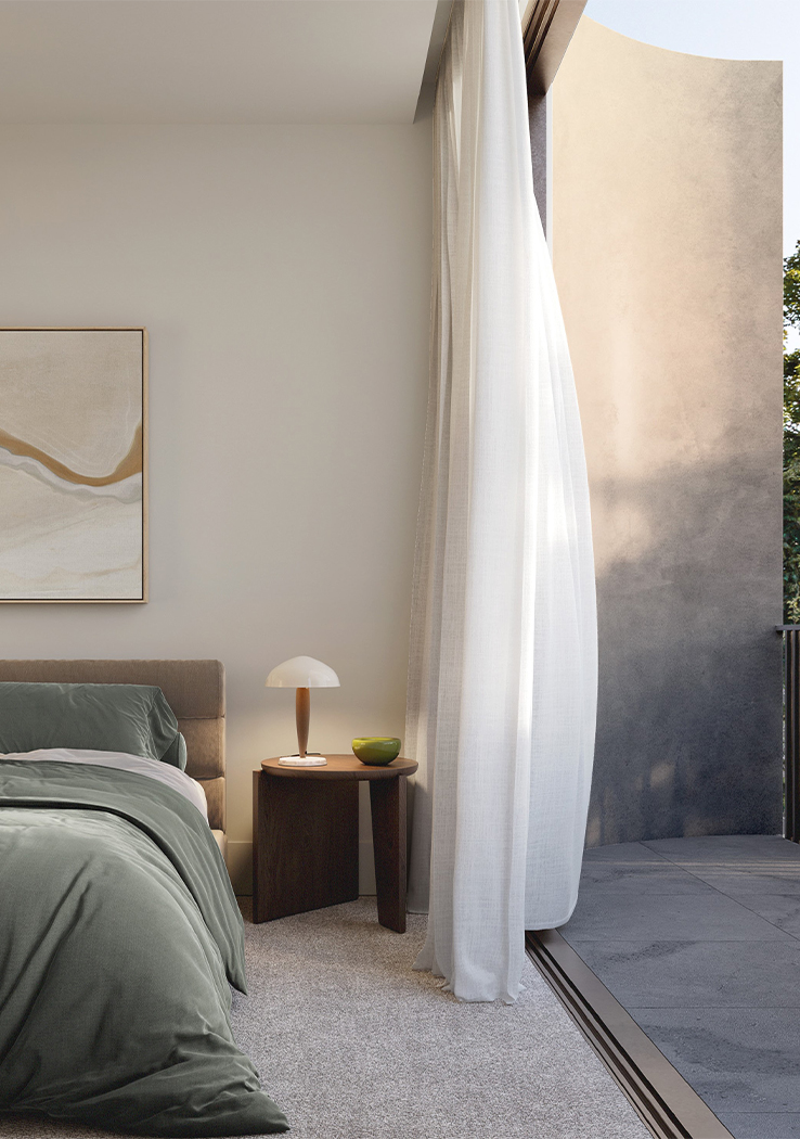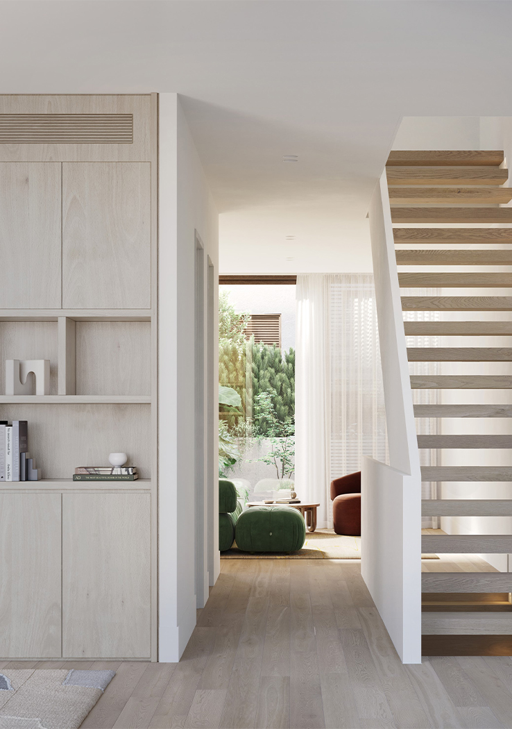 Inspired by the ebbing tide of its bayside location and responding to the dynamic sweeping curves and robust, solid forms of the architecture, Studio Tate’s design of 14 townhomes offers a calm and refined sense of luxury.