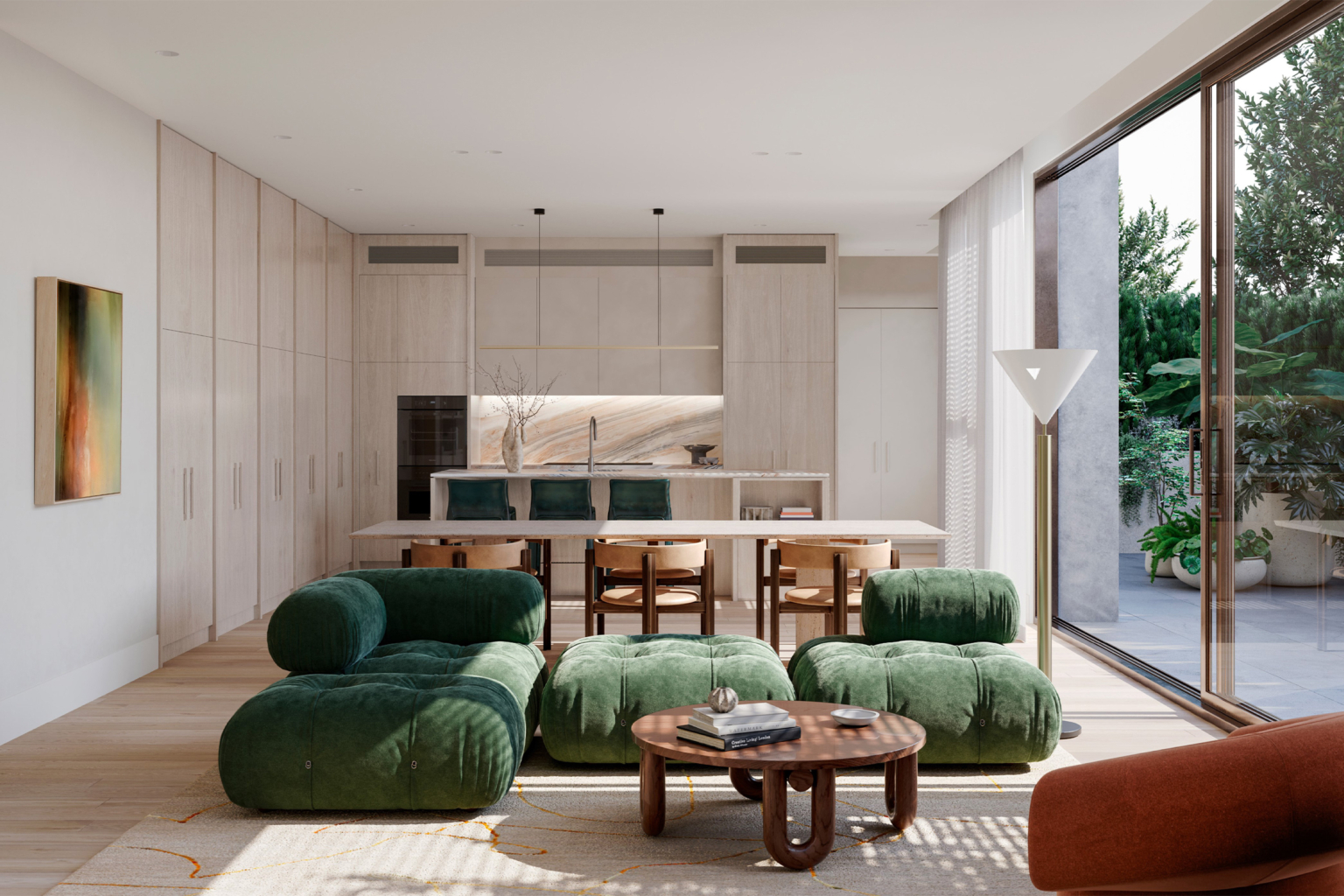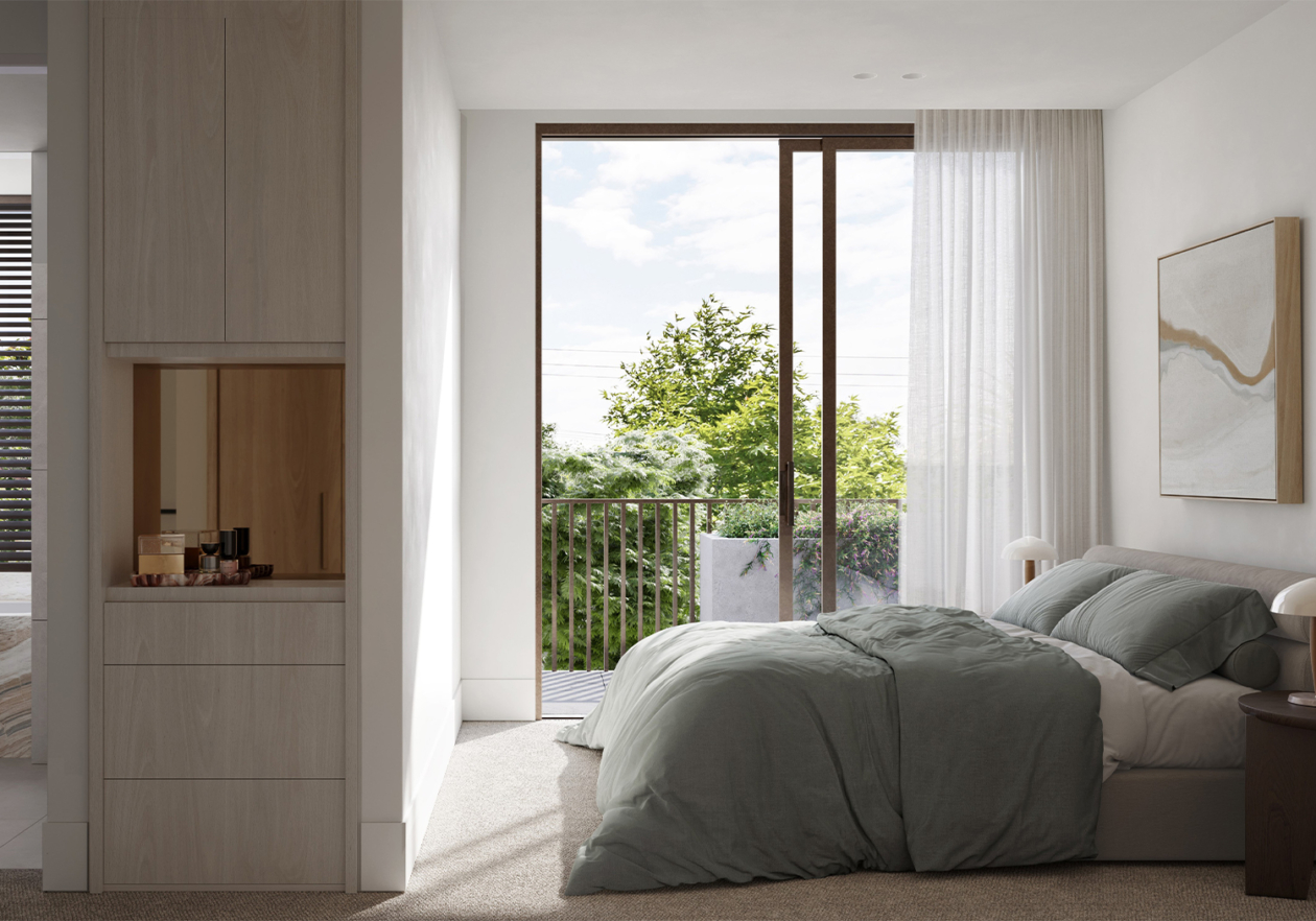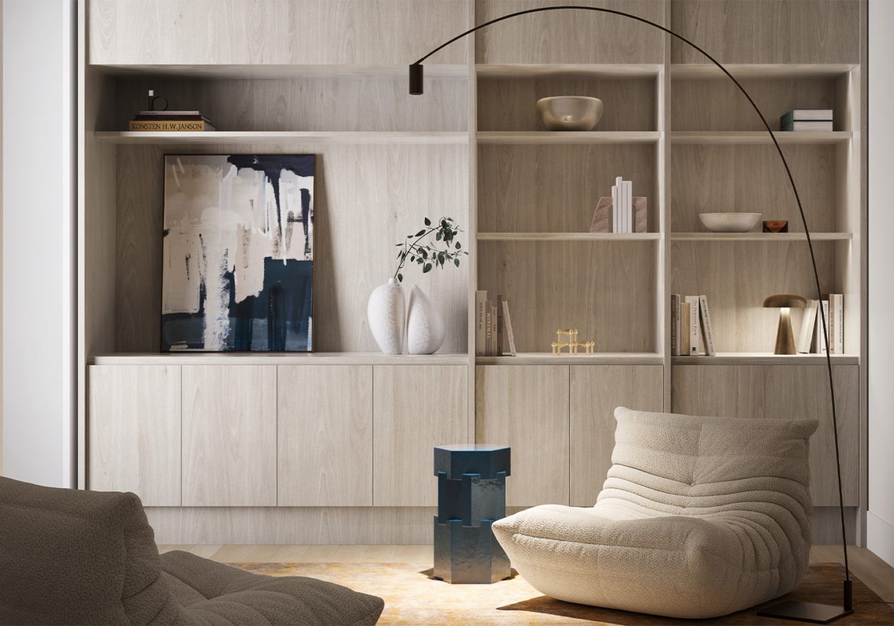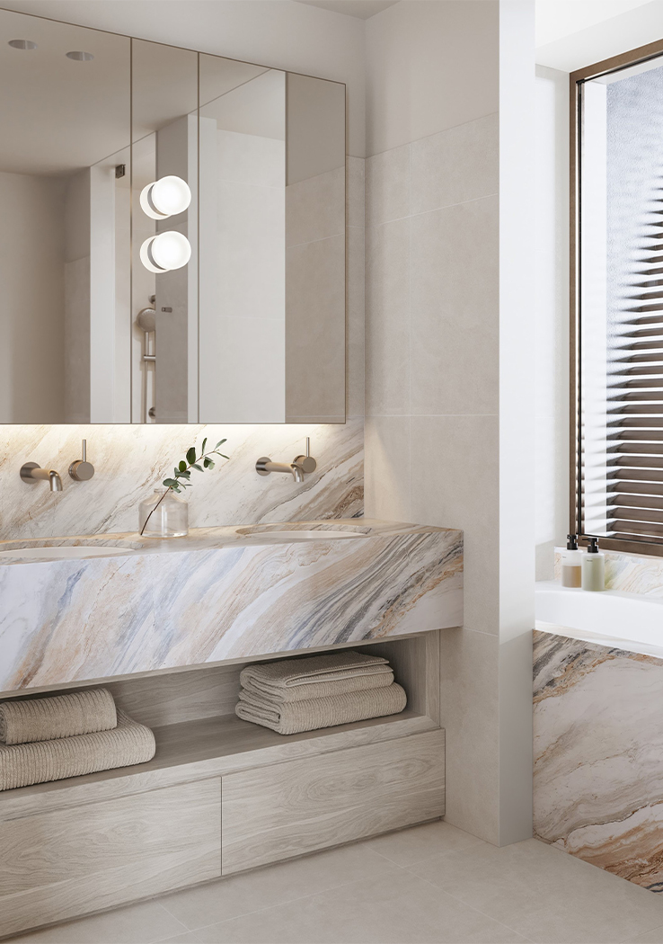 Inspired by the ebbing tide of its bayside location and responding to the dynamic sweeping curves and robust, solid forms of the architecture, Studio Tate’s design of 14 townhomes offers a calm and refined sense of luxury.