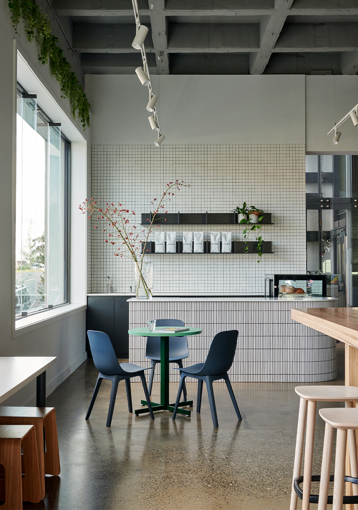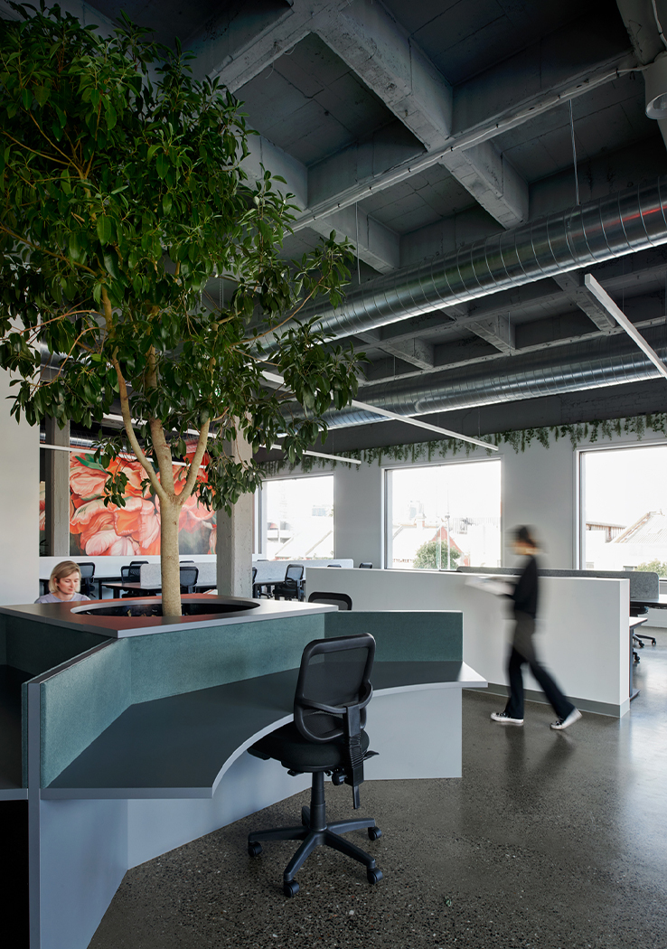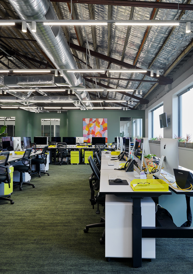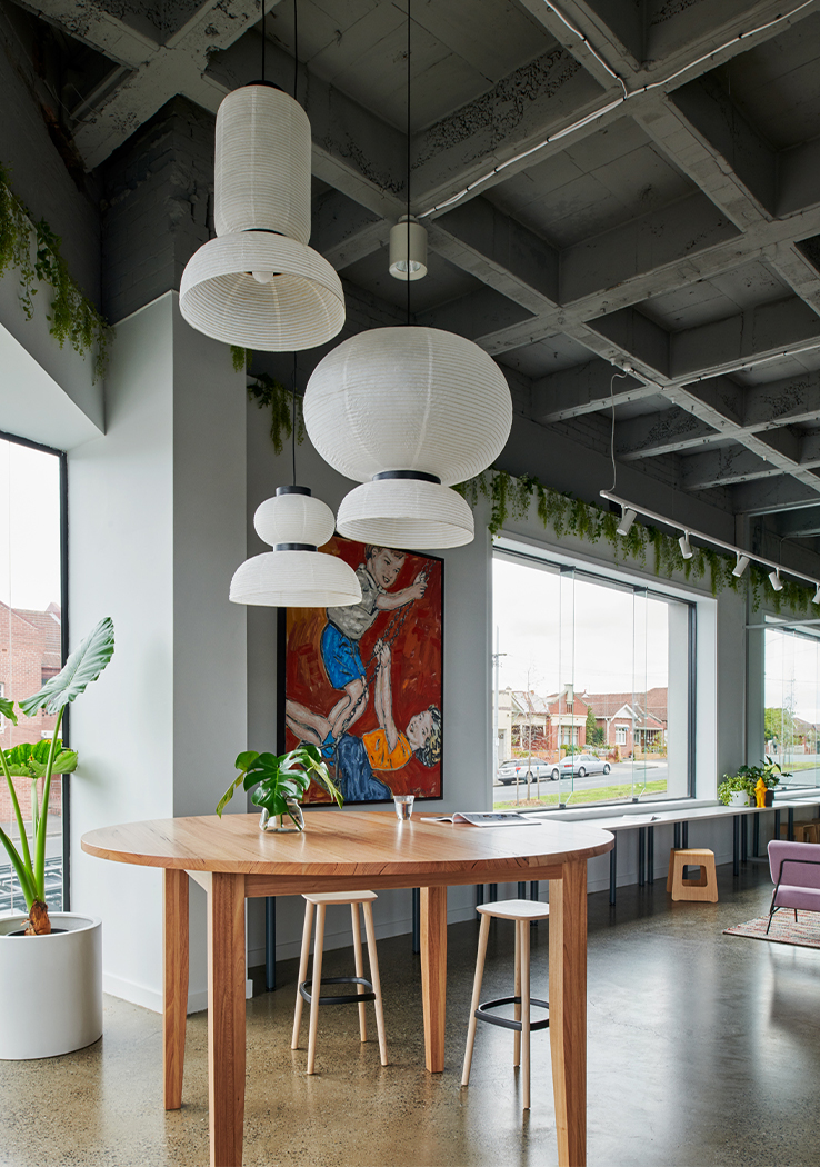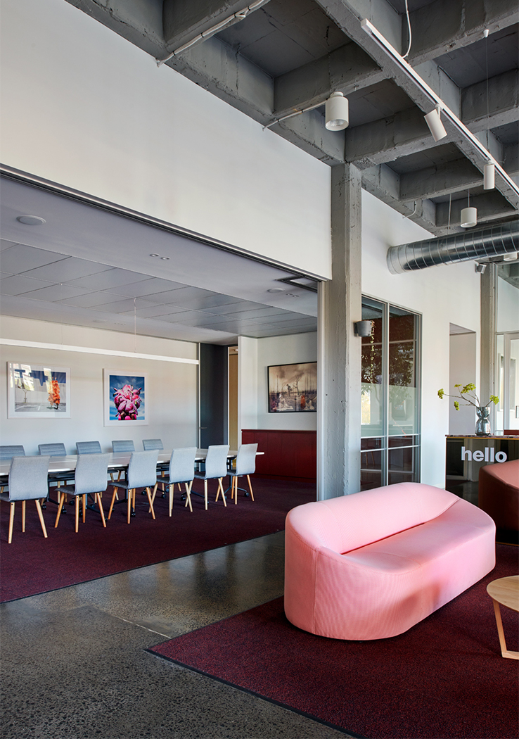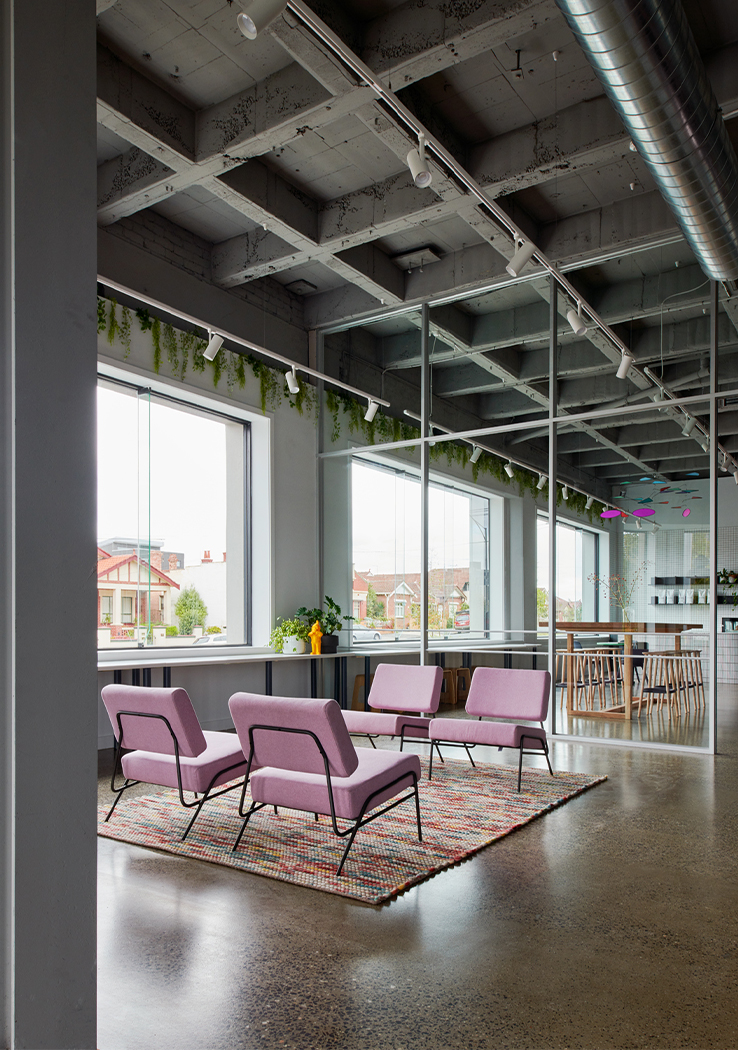 The floor plan required careful and strategic planning; finding balance in amenity, co-working spaces, private spaces for the team, and the front of house café and reception. By exposing the raw materials and simple forms of the existing building, the design celebrates the brutalist concrete structure of the front building and the steel trusses and high-pitched ceiling of the rear building. These harsh elements were softened through the injection of colour, soft finishes and furniture.