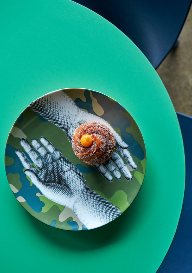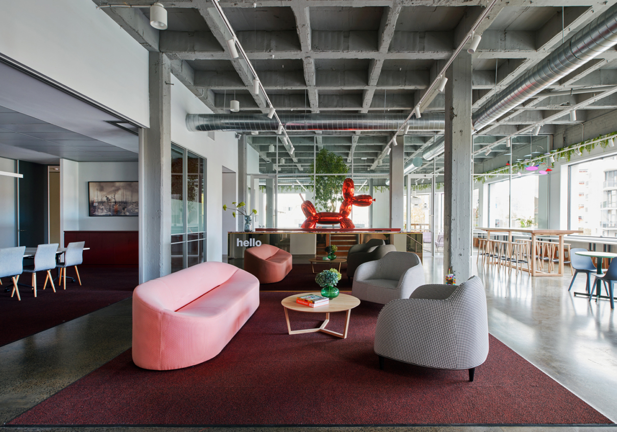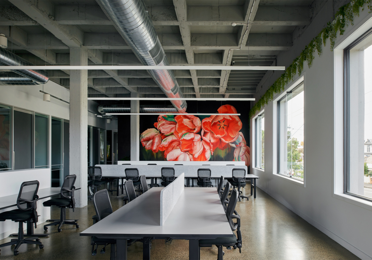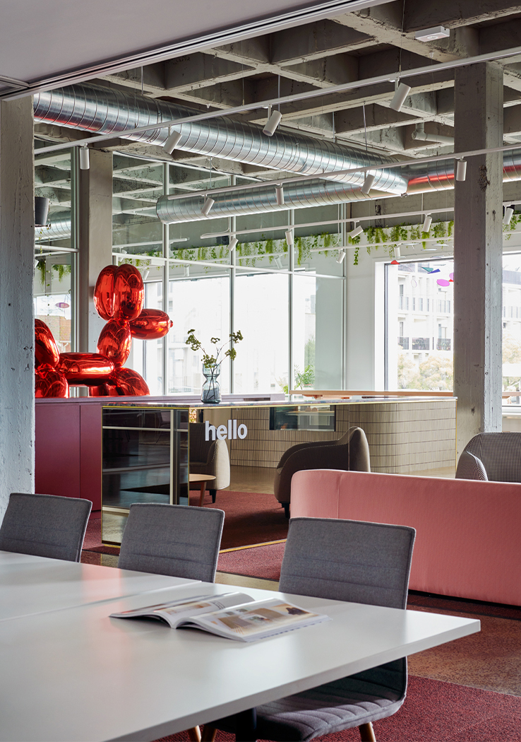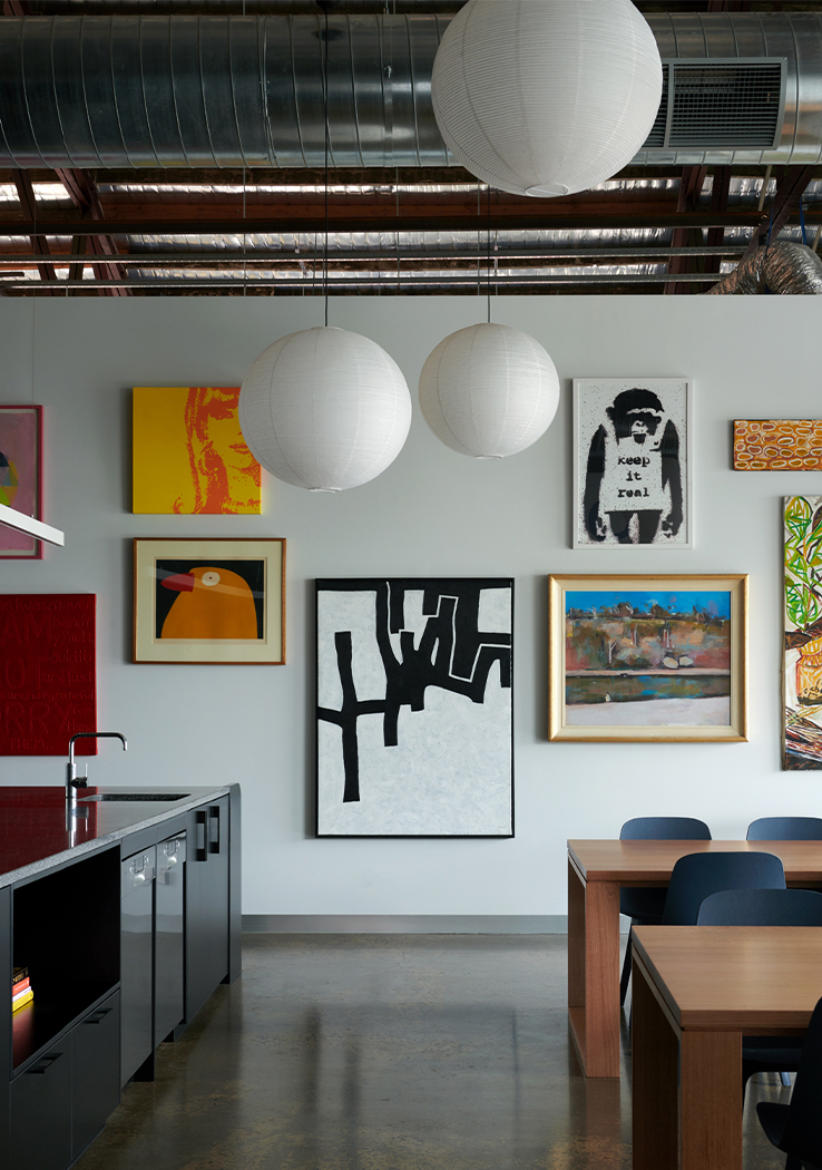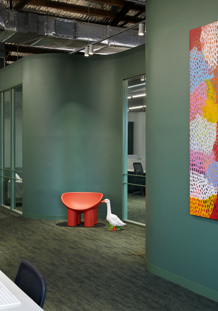 The floor plan required careful and strategic planning; finding balance in amenity, co-working spaces, private spaces for the team, and the front of house café and reception. By exposing the raw materials and simple forms of the existing building, the design celebrates the brutalist concrete structure of the front building and the steel trusses and high-pitched ceiling of the rear building. These harsh elements were softened through the injection of colour, soft finishes and furniture.