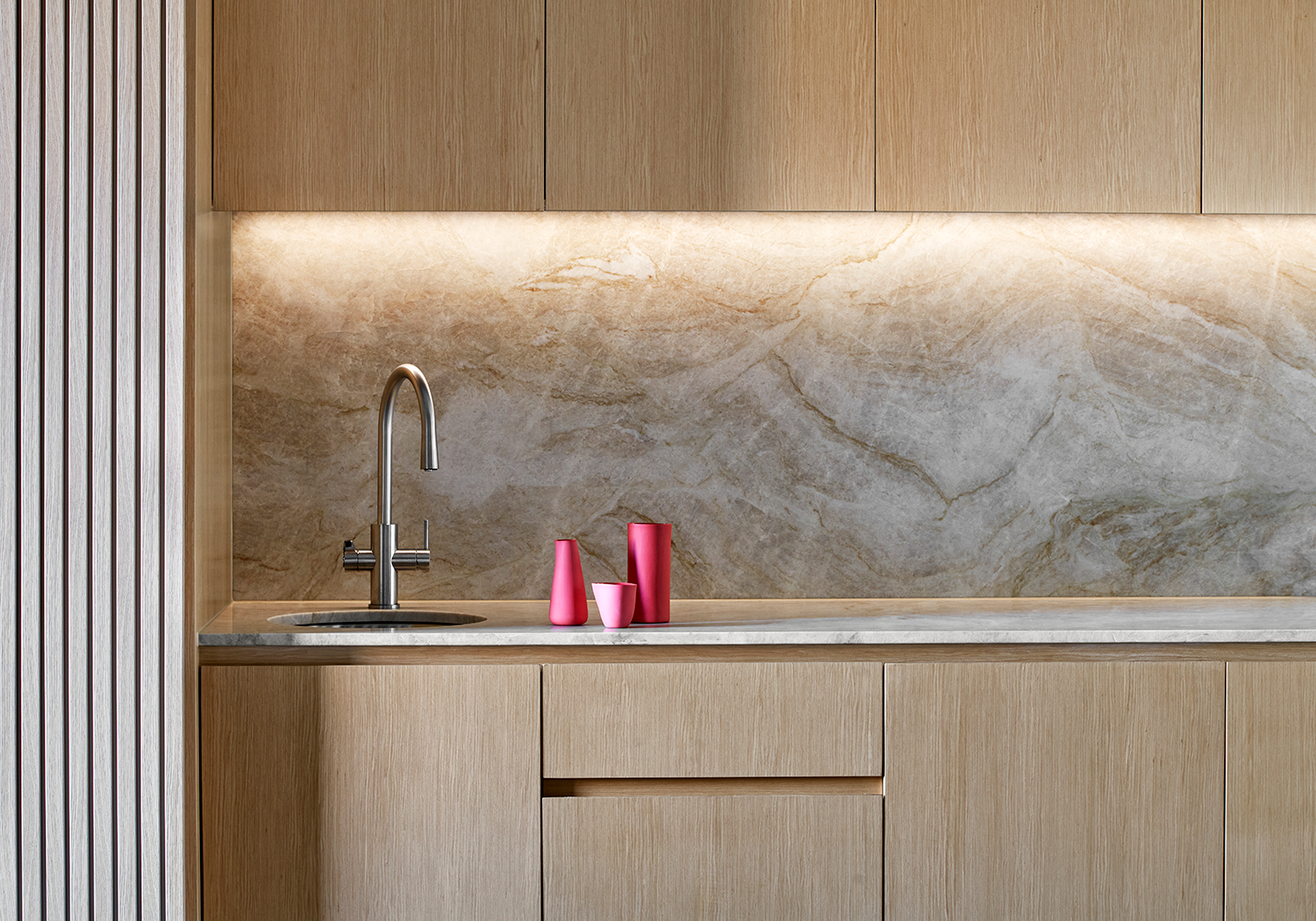 A harmonious neutral palette of warm tan, oak and veined marble with contrasting red velvets and wools, patterned black and white upholstery fabrics was used to create an aesthetic that reflects the design aesthetic and progressive culture of the client.