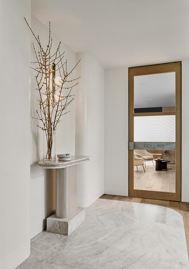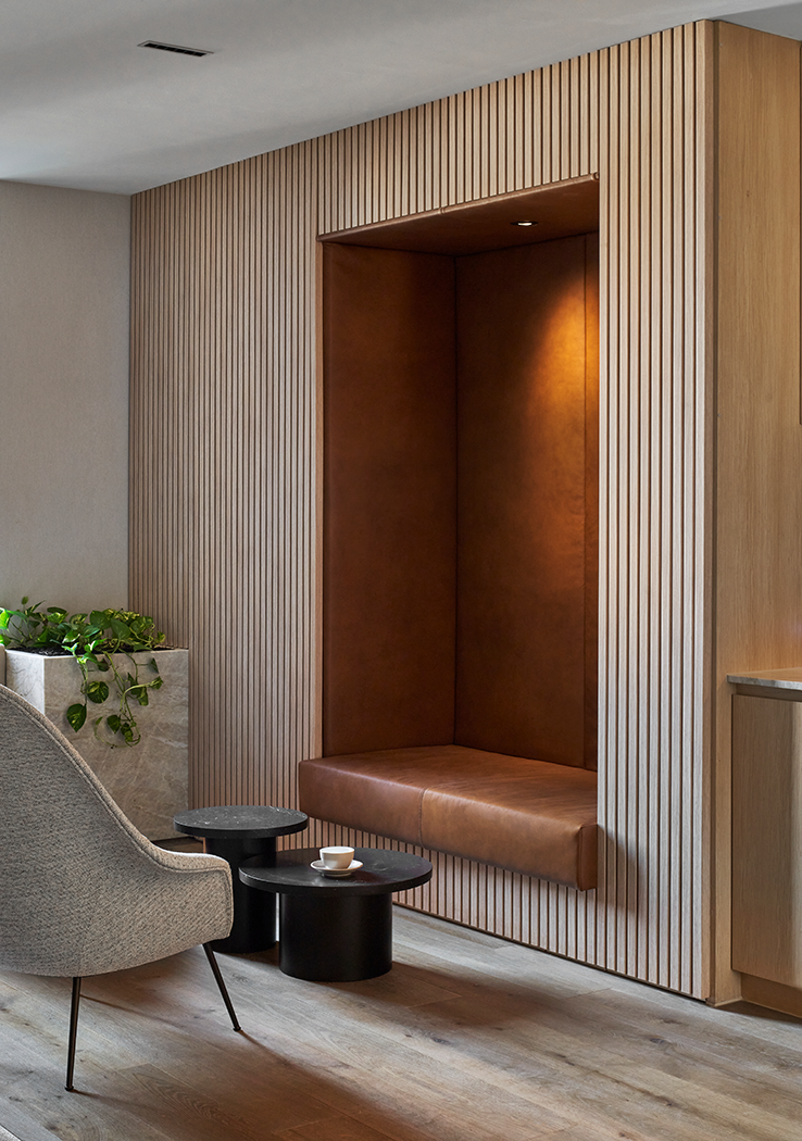 To complement the existing design office space of rich, dark tones of navy and black, cohesive finishes including timber battens, natural stone and plush carpets were used, connecting the old and the new. The meeting rooms were given a distinctive character through softer tones responding to the wellness requirement.