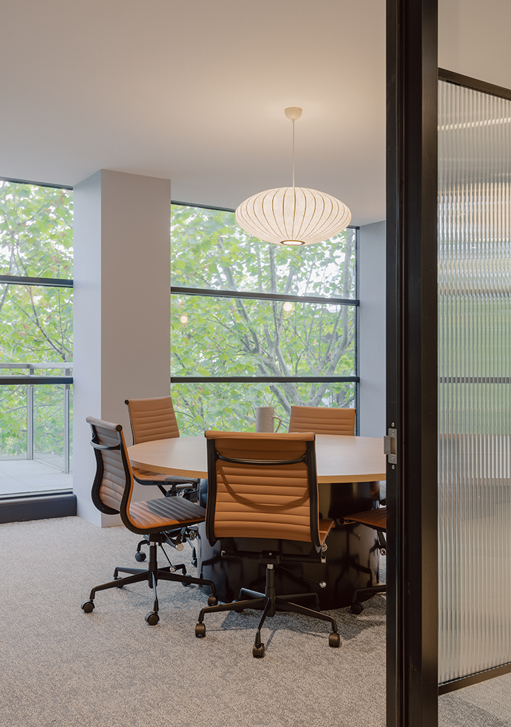The meeting room in South Haven Group’s new spec suites have been thoughtfully designed to promote a calm and productive environment. Each space features elegant pendant lighting, while tonal acoustic paneling helps create a quieter, more focused atmosphere. External windows offer sweeping views of the adjacent treetops, bringing natural light and greenery into the workplace.