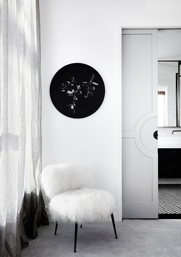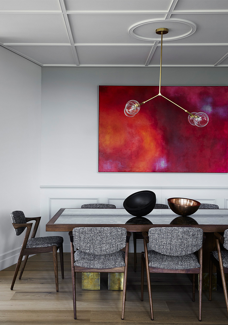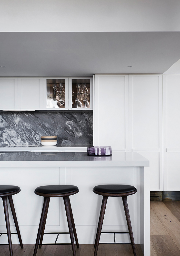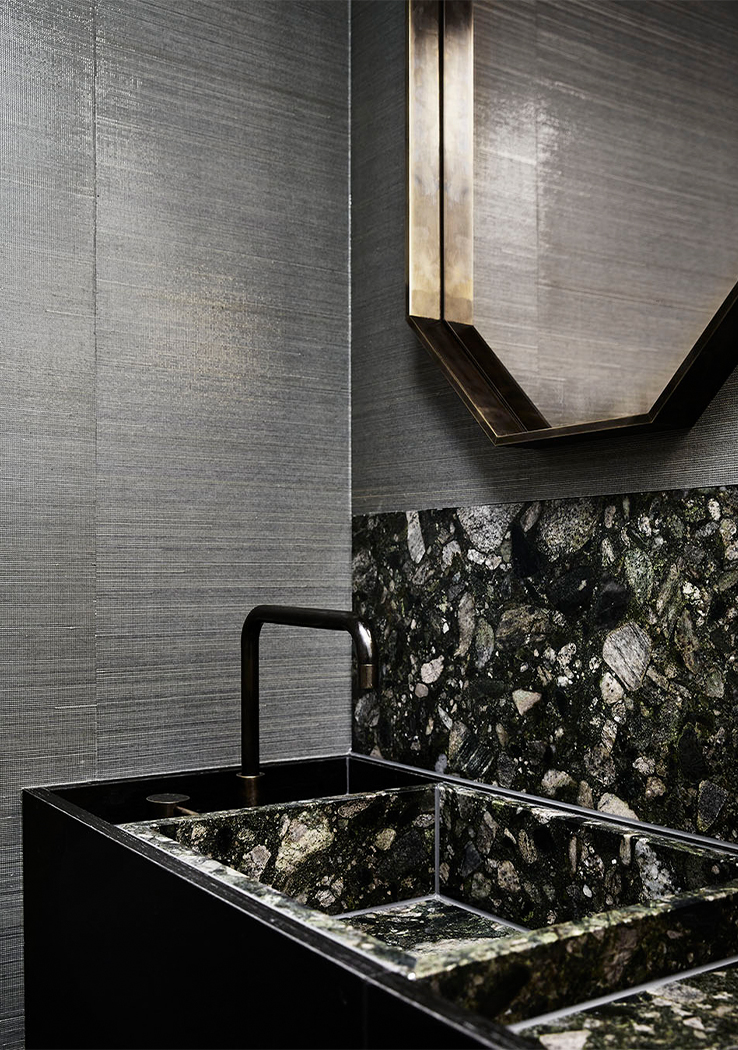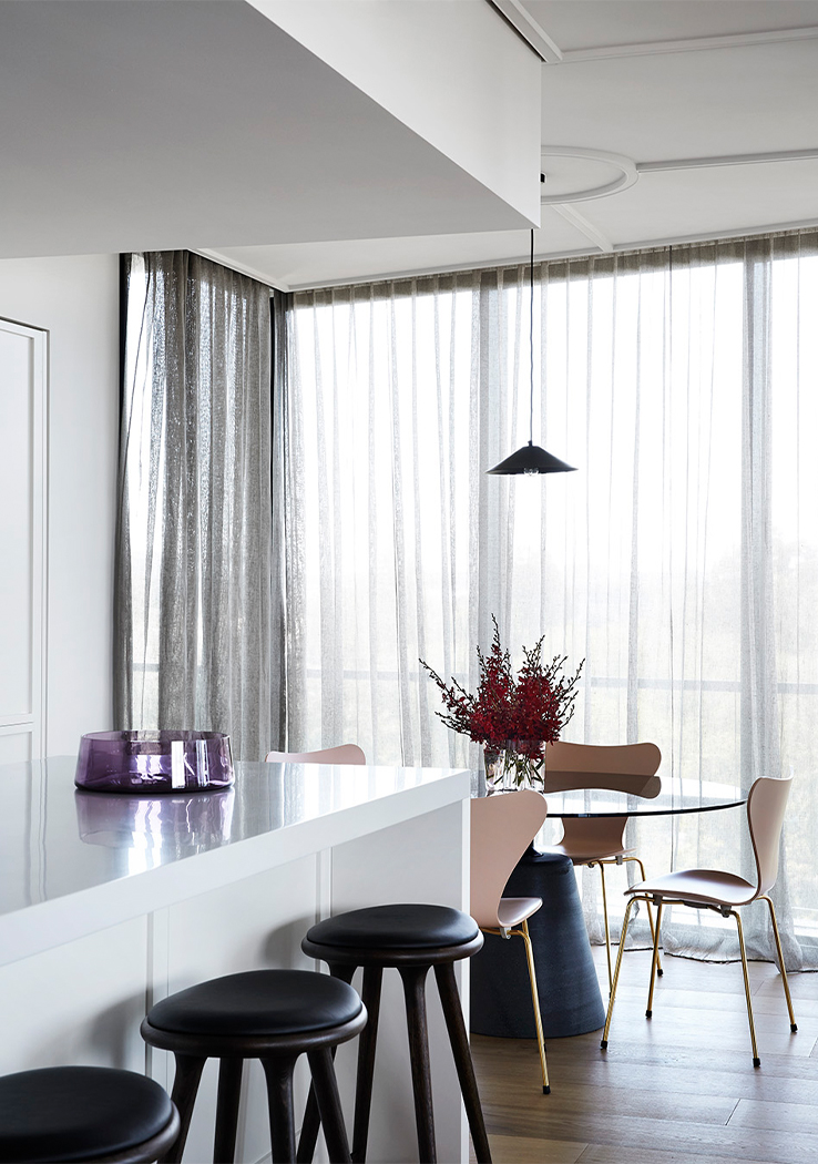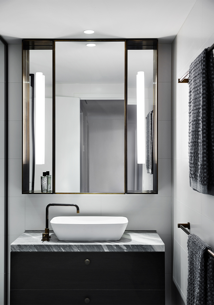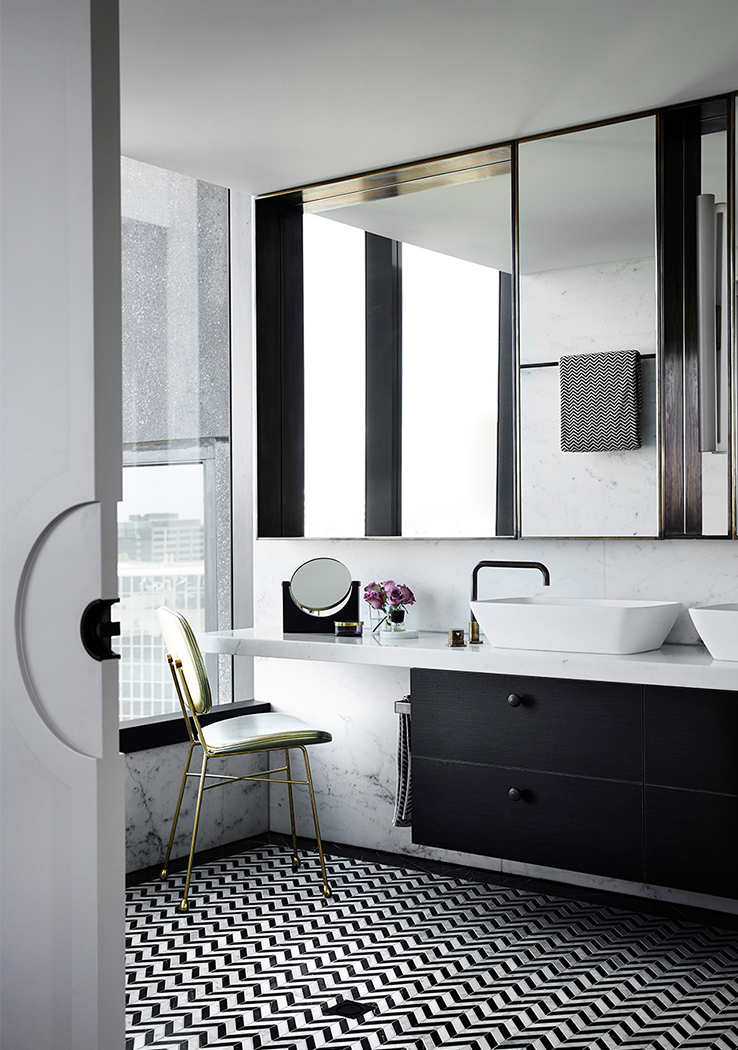 The client’s love of black and white was made a central theme throughout the apartment, such as the chevron tile with black stone border in the master ensuite. Other details are noted in the powder room with a sumptuous pink-veined green marble, pink pendant lamp and bronze mirror trim and custom features including panelling in the kitchen and living areas, detail on the ceiling strapping and distinctive lighting choices.