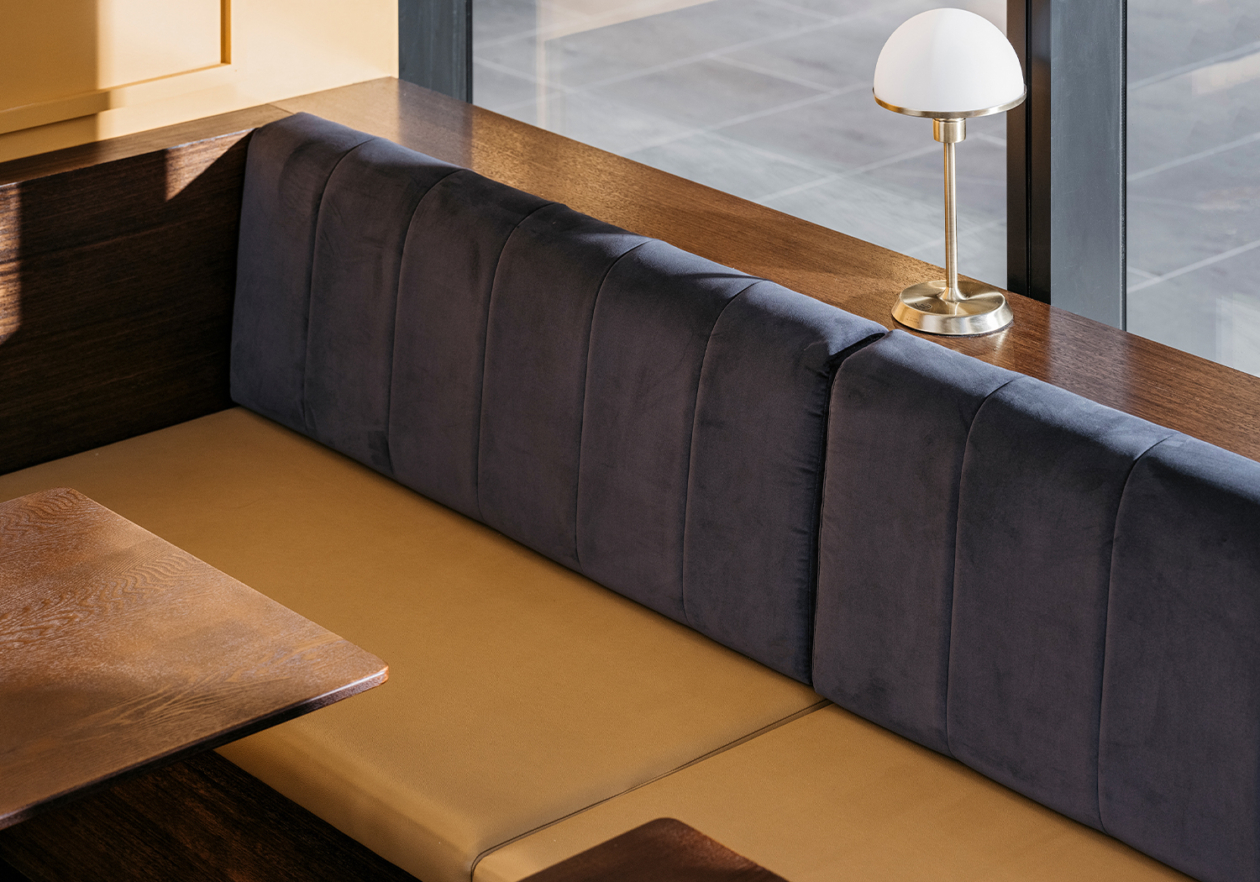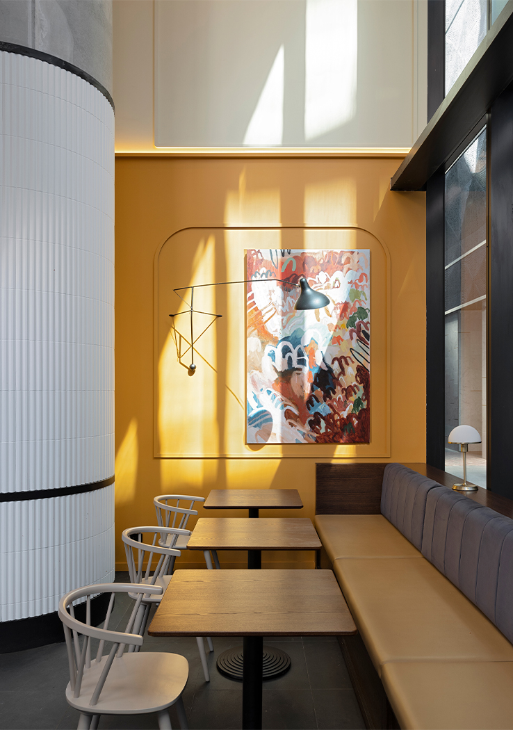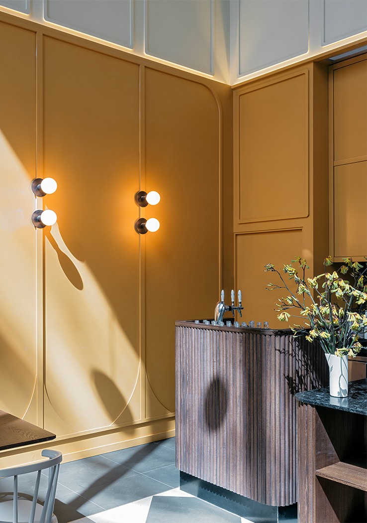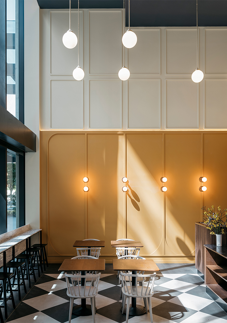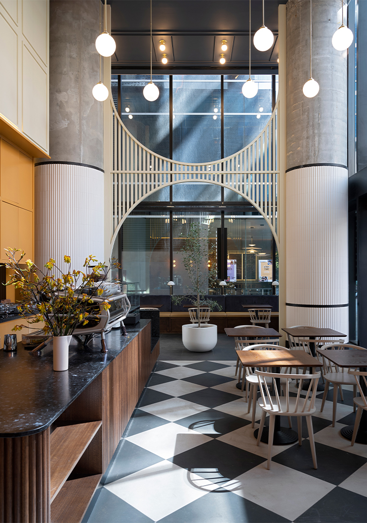 Lively, playful and dynamic, the design is inspired by the great brasseries of New York City. Strategically placed decorative lighting, casts shadow play on curved timber mouldings and the arched threshold detail, designed to accentuate the dramatic 8-meter-high ceilings.