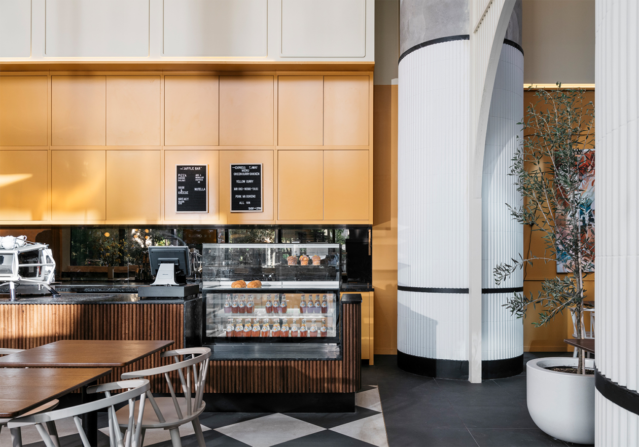 The combination of a checkerboard floor, tan leather seats, a timber dowel bar front and textured granite benchtops, creates a luxurious depth of tactility which offsets the vibrant palette. With a nuanced realisation of Workshop Brothers’ brand philosophy, Studio Tate has delivered a visual identity which balances playfulness with sophistication.